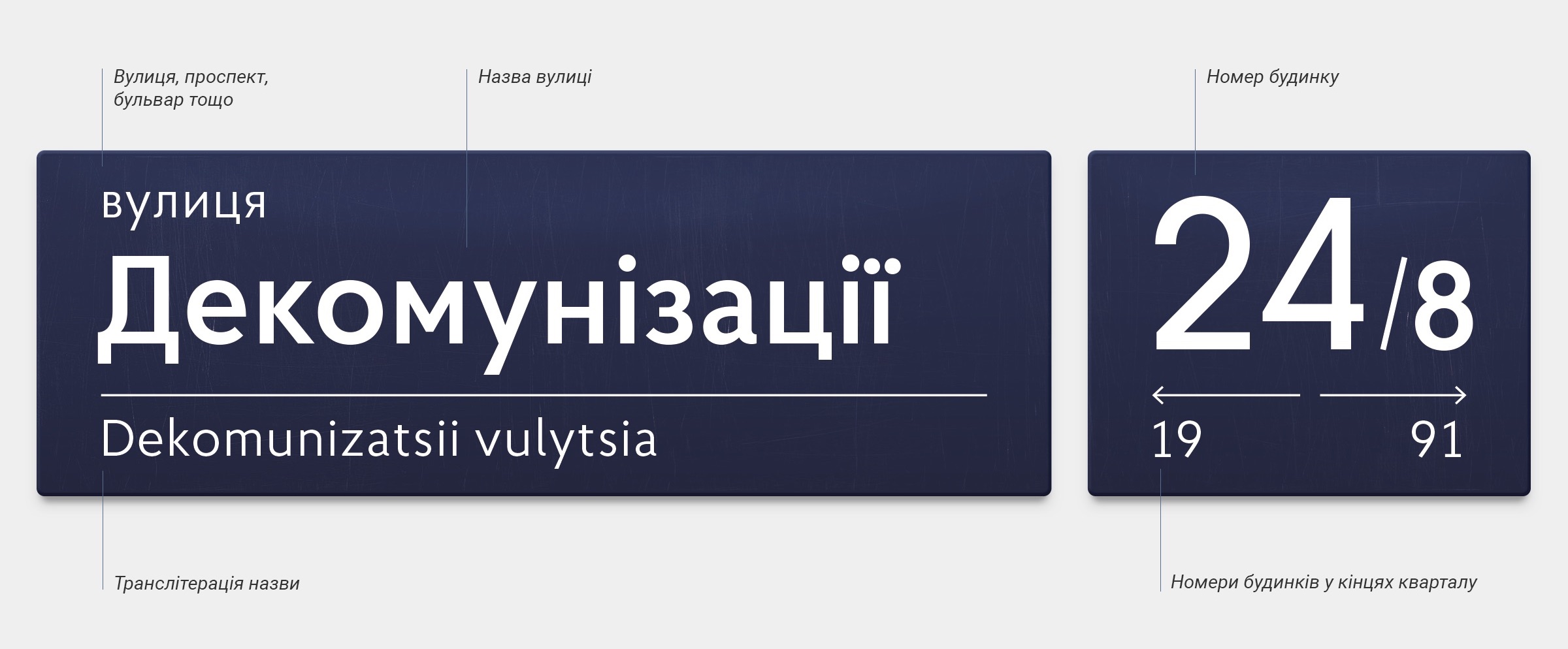 Для більшої гнучкості в компонуванні вивісок на фасаді та для зручнішого розташування вздовж вулиць ми розділили між собою вказівники назви вулиці та номеру будинку. Тепер це два незалежних елементи, кожен з яких розміщується у відведеному для нього місці, проте нічого не заважає компонувати їх як єдиний знак. Покажчики вулиці розміщуються в місцях, де людина потрапляє на вулицю (наприклад, на кутах кварталів), а покажчики номерів — на кожному будинку. Так ми даємо лише ту інформацію, яка необхідна в конкретному місці, та зменшуємо кількість табличок.