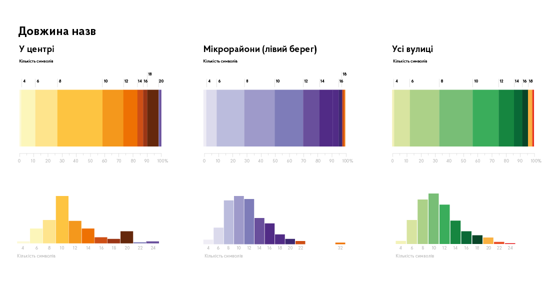 Ми проаналізували назви всіх 2387 вулиць з розподілом по кількості слів та кількості символів і визначили довжину назв, яка зустрічається найчастіше — 10 символів. Її й взяли за основу для типового розміру таблички.
